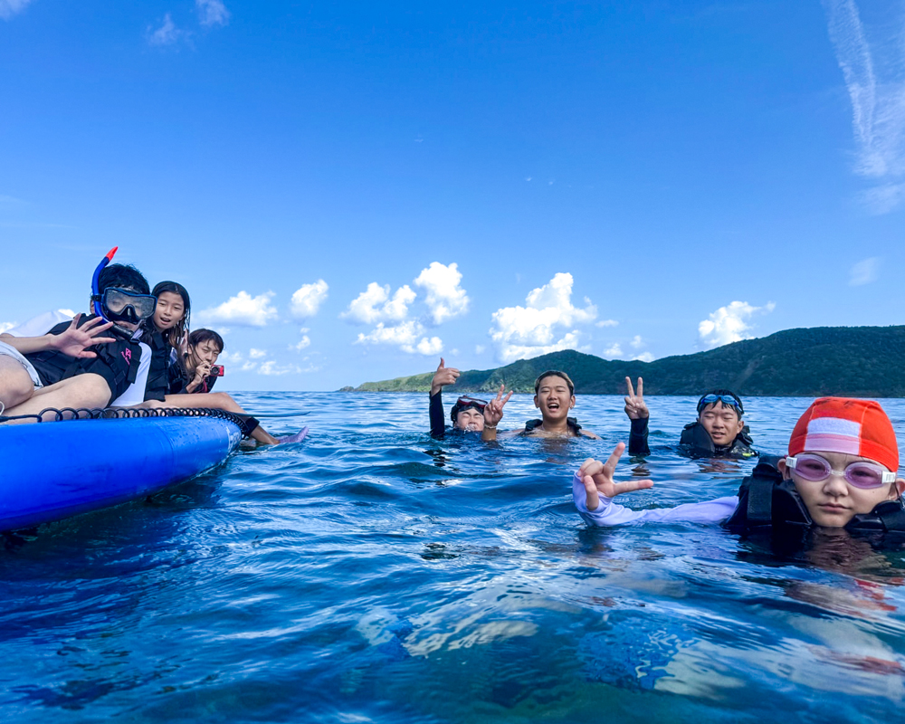 この日はSUP(スタンドアップパドル)や海洋生物やサンゴ鑑賞、海への飛び込みアクティビティを満喫。この数週間ですっかり奄美っ子になってた在校生は体験生たちをリードし、「大丈夫!楽しいよ!」と励ます頼もしい姿が印象的でした。