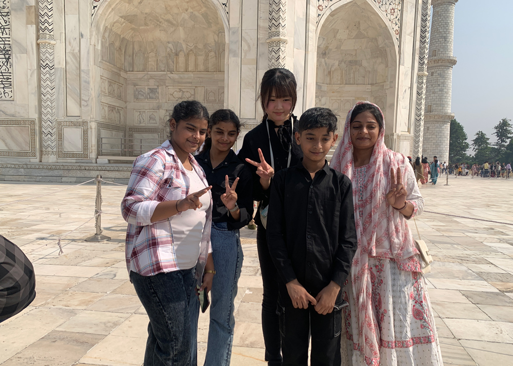 ここタージマハルでも、囲まれてお願いされる場面が多々。「世界遺産を見に来たはずが、こっちが撮られてる…!」という状況に、引率のチューターたちも思わず苦笑い。